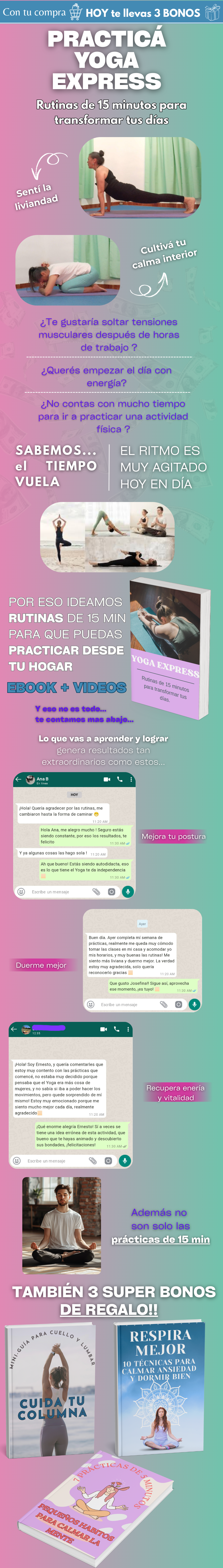“Tenía rigidez en la columna y poco tiempo para mí. Con Yoga Exprés empecé con 15 minutos al día y en una semana ya dormía mejor. Las respiraciones del ebook me ayudaron a bajar la ansiedad y volver a sentir mi cuerpo más liviano.”